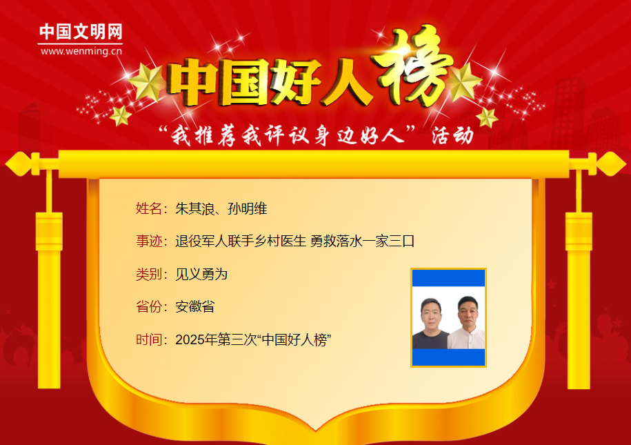 朱其浪,男,1993年11月生,中共党员,滁州市明光市泊岗乡村民;孙明维,男,1973年6月生,滁州市明光市泊岗乡村医。2025年4月19日,淮河明光段泊岗乡引河渡口,一家三口驾驶三轮车等待轮渡时,车辆意外失控冲进水深流急的淮河中,母子二人被困车内无法脱险。危急关头,在岸边等待渡河的朱其浪挺身而出,两次潜入水底,仅用7分钟成功救起一家三口。上岸后,村医孙明维对昏迷母子持续进行心肺复苏近20分钟,成功挽回生命。