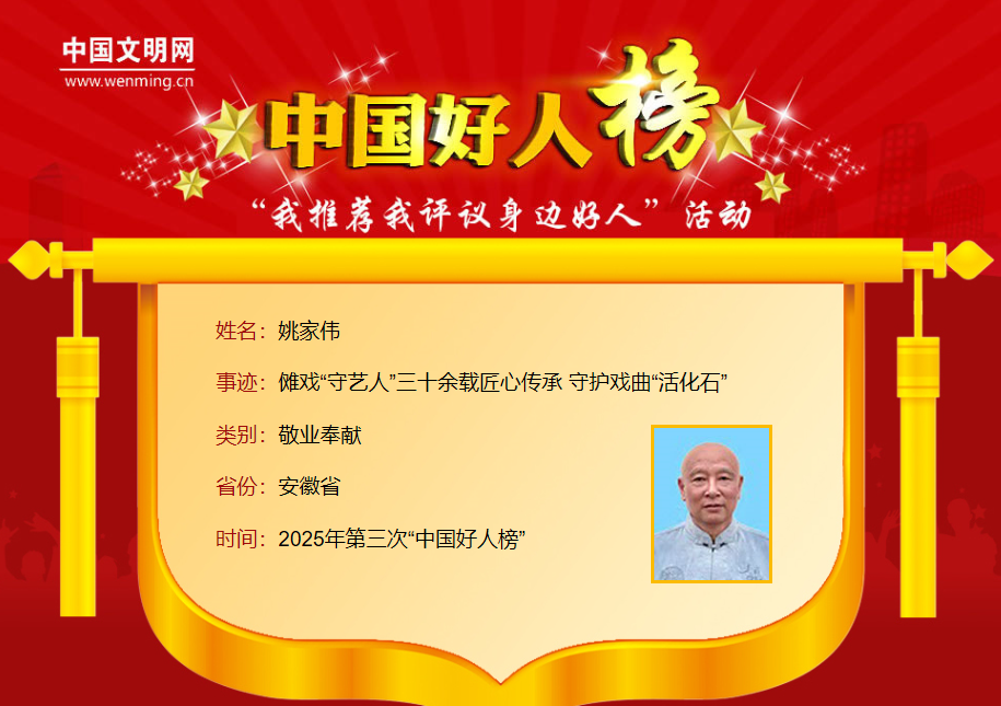 姚家伟,男,1965年8月生,池州市贵池区梅街镇姚街村村民。姚家伟自幼受父亲影响热爱傩戏艺术,数十年来潜心钻研表演技艺。从面具佩戴到高跷踩踏,从罡步练习到唱腔打磨,他以匠人精神将这门濒危艺术发扬光大。姚家伟不仅抢救整理了《孟姜女》等传统剧目,还创新改编了《五星观赏》等新作品。他已坚持正月傩仪表演300余场,培养了10多名传承人,并推动傩戏走进校园、走向国际。2008年2月,姚家伟被文化部认定为国家级非物质文化遗产项目(池州傩戏)代表性传承人。