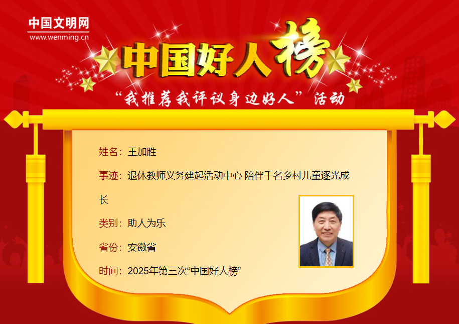 王加胜,男,1961年1月生,马鞍山市和县濮集初中退休教师。2014年,王加胜拆除自家每年纯收入8万元的10间炕坊,创办留守儿童活动中心,先后义务辅导了1126名孩子。11年来,筹资13万元,在中心内累计开展素养教育、体育比赛、安全知识讲座等主题活动500余场,举办留守儿童夏令营、行走美丽乡村、瞻仰红色教育基地等研学活动180余场,带领孩子们走出乡村,开阔眼界。王加胜曾获安徽省“十佳学雷锋志愿服务优秀典型”等荣誉。