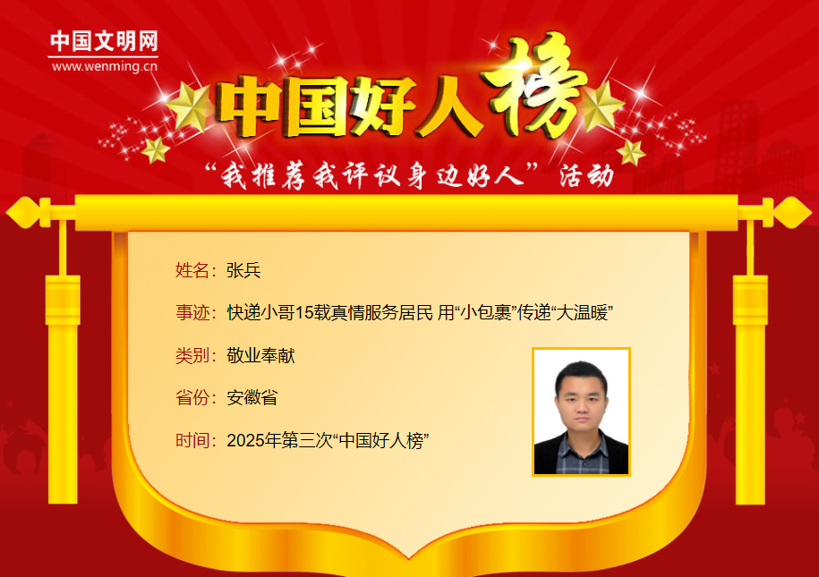张兵,男,1990年2月生,中共党员,淮南市某快递潘集分公司快递员。入职快递员15年,张兵勤勉务实、用心坚守,见证行业发展。他用一线工作经验总结客户服务指南,成功使顾客投诉率降低60%,拿下公司总部创新大赛“金点子”奖。他总是将居民的事当成自己的事,真情服务温暖人心。当选安徽省人大代表后,他为新就业劳动者群体积极发声。张兵曾获全国交通技术能手、最美快递员等荣誉。