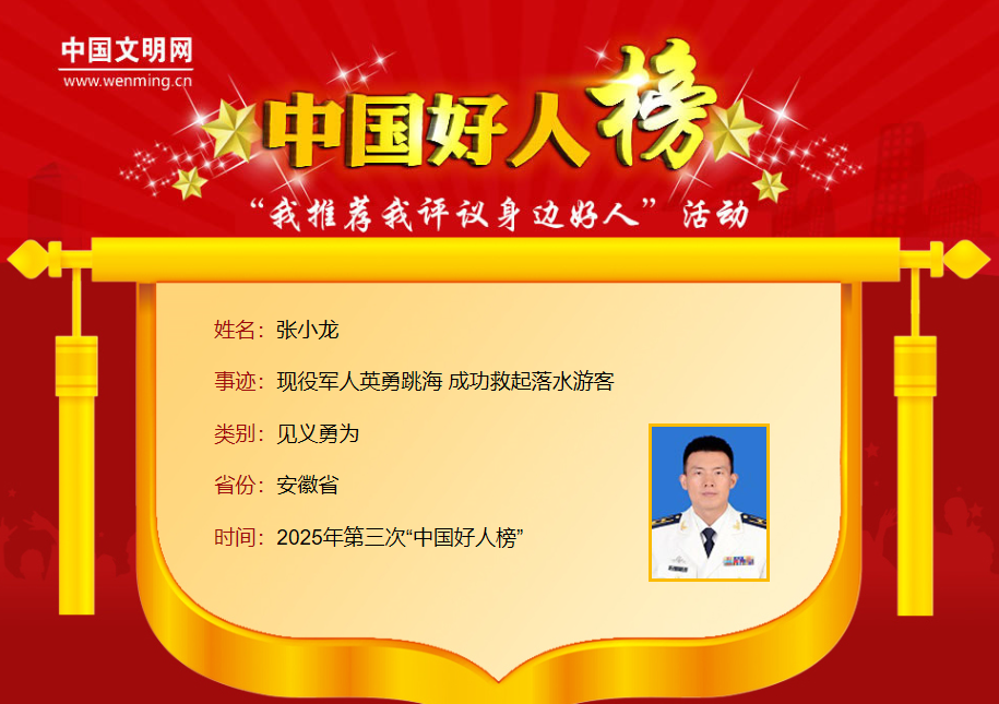 张小龙,男,1986年11月生,北部战区海军某部军官,阜阳市太和县人。2025年6月22日清晨,青岛崂山八仙墩景区海域,一名游客不慎滑落海中,被汹涌海浪卷向深水区。正在附近的张小龙闻讯立即上前施救,在湿滑礁石上重重摔倒后仍忍痛跃入海中。面对湍急海流,他凭借部队练就的救生技能与风浪搏斗十余分钟,最终成功救起落水者。救援过程中,他全身多处擦伤,确认落水者安全后未留姓名便悄然离去。其事迹经央视新闻、人民日报、央广网等中央媒体报道后,引发社会广泛赞誉。