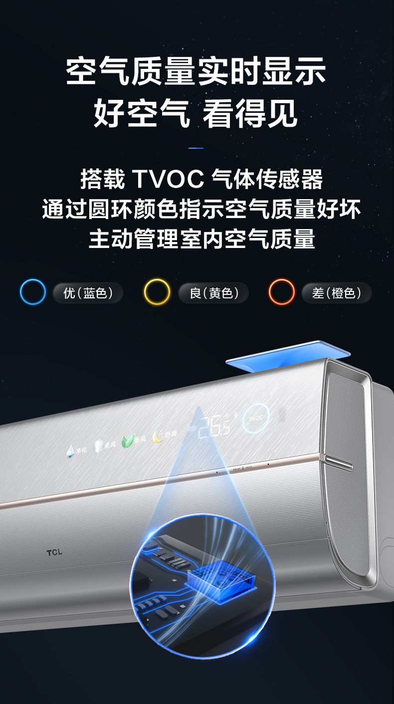 作为对生活品质要求极高的精致人群,一定会在意室内空气质量。TCL小蓝翼C7新风空调搭载的TVOC气体传感器,能实时监测卧室里甲醛、苯、PM2.5等有害物质的浓度,还会通过面板上的氛围灯直观呈现空气TVOC浓度,主动调节新风——蓝色代表空气优质,黄色提示良好,红色则会自动开启新风。