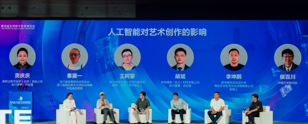 接下来的两场圆桌对话,展现了文创嘉宾对人工智能的观点碰撞和文创相关领域的现实状态。第一场圆桌对话《人工智能对艺术创作的影响》是由康智达数字技术(北京)有限公司总经理贡庆庆女士主持,对话嘉宾有浙江省老教授协会副会长、中国美院教授辜居一先生、浙江财经大学人文与传播学院教师、导演王阿蒙先生、中安镜像(杭州)科技有限公司执行董事、总经理胡斌先生、西安冬学影视文化传媒有限公司创始人李坤鹏先生和中国艺术研究院教授侯百川教授。几位嘉宾都坦诚清晰地表达了自己的鲜明的观点,并且在讨论中就发出了不同意见的声音,展现了“和而不同”的君子风度和独立思考、孜孜以求的学术精神。