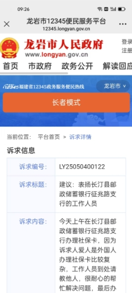 近日,福建省龙岩市12345政务平台接到一通电话,让接线员感到惊讶的是,电话那头并非“投诉”,而是当事人对一家银行网点的满满赞许。