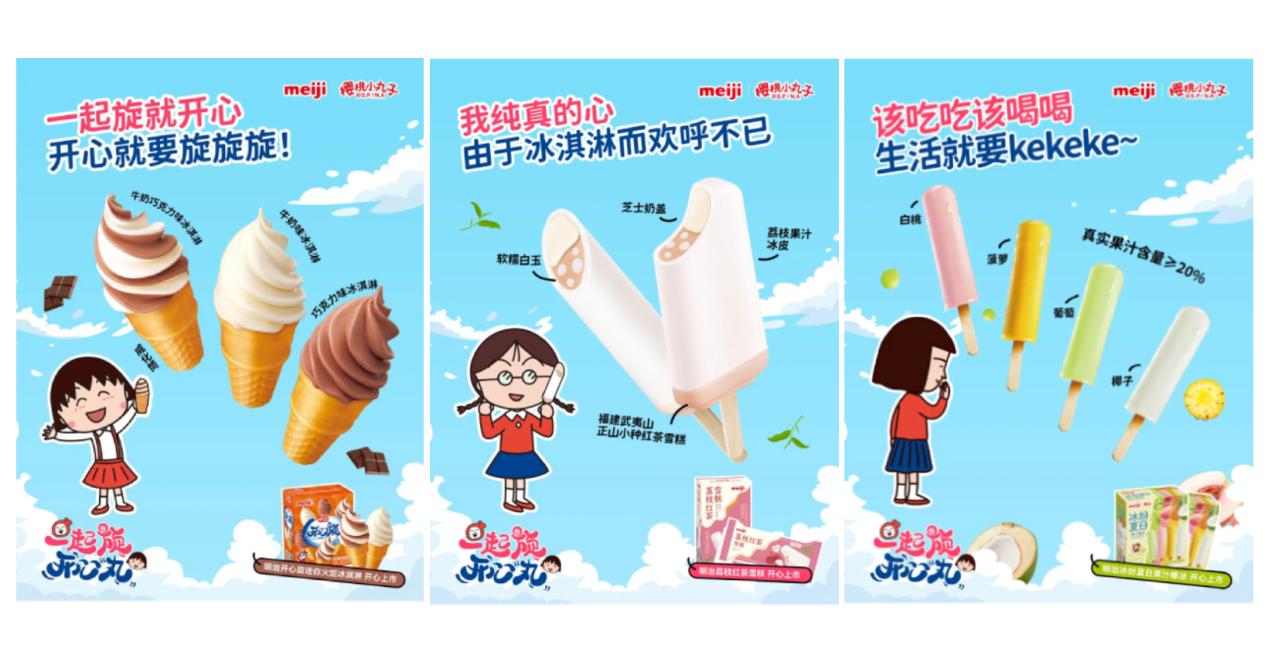 所以,本次明治雪糕与樱桃小丸子的跨界合作并非偶然。樱桃小丸子,这一承载了几代人童年记忆的经典国民IP,以其活泼可爱、天真治愈的形象,成了许多中国女性们成长期的自我形象代表,与明治雪糕“有料、开心”的品牌文化高度契合。