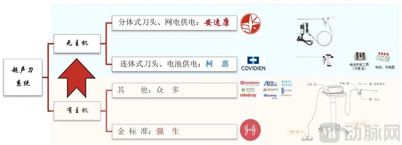 其中,有主机超声刀阵营以强生为核心代表,涵盖众多国产品牌及部分进口品牌,其产品核心构成模式高度统一,均为“主机+手柄+刀头”的组合形态;无主机超声刀阵营目前在全球范围内仅有两家企业:美敦力与安速康。尽管两者产品均无需独立主机,但在刀头结构、供电方式等产品设计与功能细节上存在显著差异。