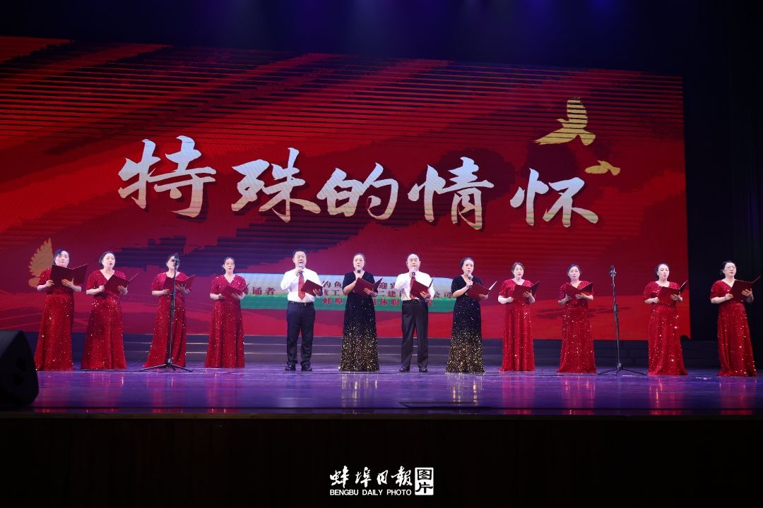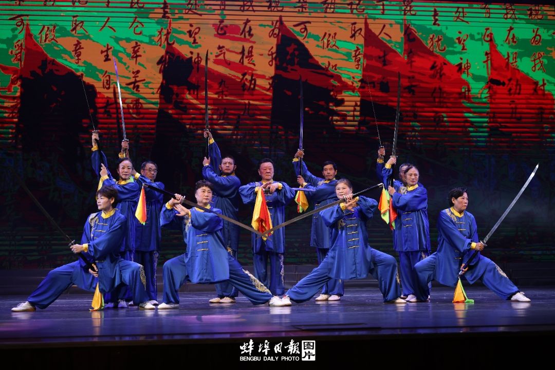 汇演现场气氛热烈,节目形式丰富多样。器乐合奏《电影(地道站)组曲》,将观众带入了抗日战争的峥嵘岁月,展示艰苦年代群众的聪明智慧。反诈情景剧《假面亲情》以快板+群口的方式揭露养老金诈骗陷阱,通过幽默与警示并重的表演,引发观众强烈共鸣。武术表演《万胜苗刀百年传承》,78岁高龄非遗传承人带领弟子们娴熟的武艺表演、矫健的身影让人过目难忘。诗朗诵《特殊的情怀》讴歌了蚌埠市驻地企业核工业二二公司职工为中国的国防事业努力和无悔奉献。舞蹈《兰花赋》以优美的舞姿将花鼓灯技艺的热烈奔放展现的淋漓尽致。参演者平均年龄65岁以上,他们以饱满的精神状态和专业的舞台表现,赢得台下阵阵掌声,观众们纷纷用手机记录下这些精彩瞬间。