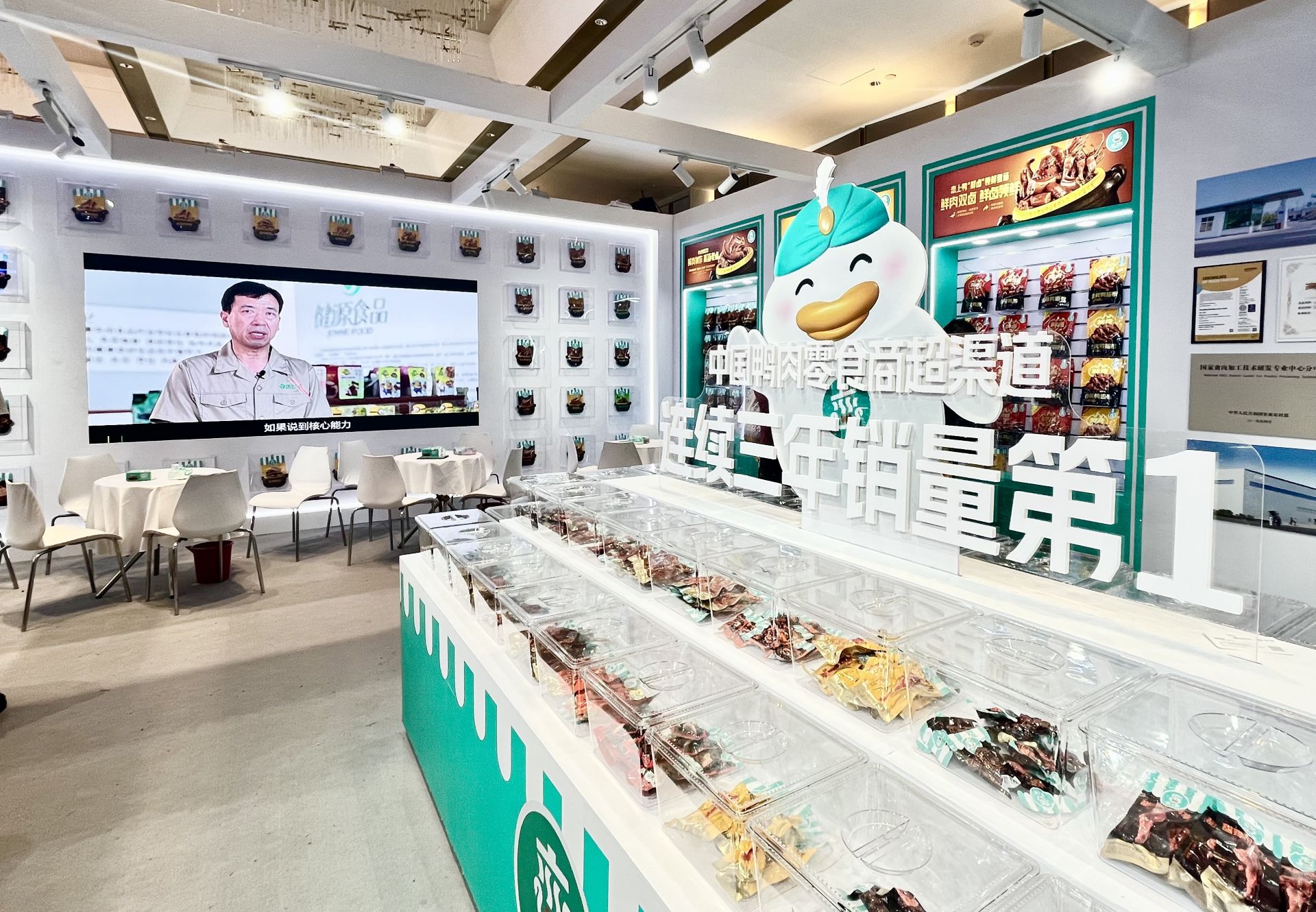 产品矩阵的丰富性更彰显品牌实力——“领鲜”鲜卤系列、热销甜辣系列、人气老卤系列、不辣经典香烤系列形成主打产品矩阵在一整面墙上整齐陈列,创意新颖又时尚的透明陈列柱特别吸睛,还有大礼包、礼盒产品陈列专区,全面覆盖不同渠道需求。在洽谈区,不少采购商在试吃后对恋上鸭的产品口味大加赞赏并且达成合作意向。