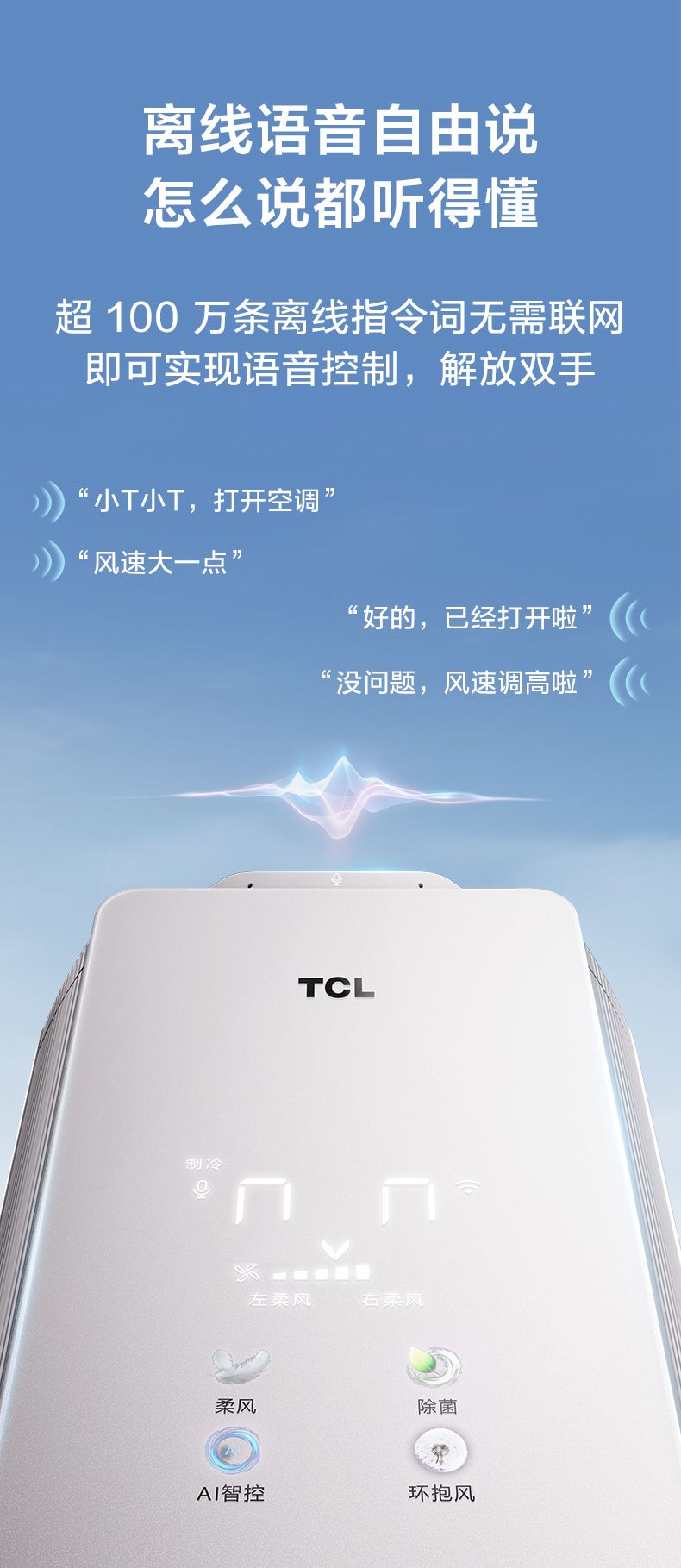 在实际操作中,TCL小蓝翼P6 Plus AI健康空调拥有第二代离线语音自由说,搭载超100万条离线指令词,可实现语音控制,只需喊出“小T小T”即可唤醒空调,进行调控,解放双手。同时,还能根据声音精准识别人体位置,实现“风向人吹”或“风避人吹”。即使是家中的老人也能快速上手,无需复杂的操作步骤。