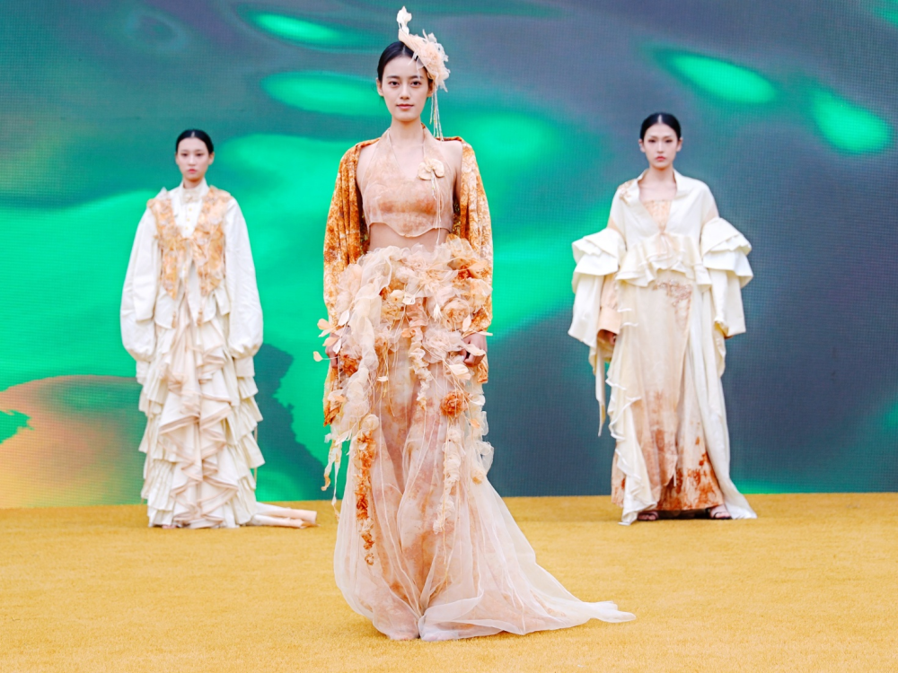 活动当日,“丝路唐韵”服装秀惊艳全场,柿漆染就的棕褐纹路,缀以唐式纹样,古朴与现代交织生辉;艺术教室内,游客还可亲手DIY柿染方巾,带走“秋日色彩”。这背后是西安美术学院的深度赋能:双方共建“柿染文创微专业”,以现代设计活化非遗;学生通过直播销售作品,打通“艺术+产业”闭环,为特色产业发展注入新活力。