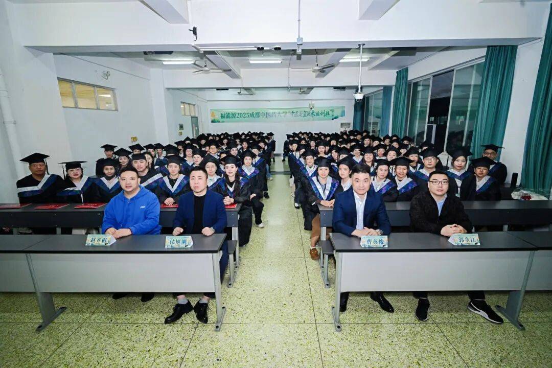 在毕业典礼上,四川福能源生物科技有限公司副总裁、新零售总经理曹英俊先生登台致辞。他首先向成都中医药大学致以谢意,感谢校方提供专业的教学场所与学术支持。随后向顺利结业的全体学员致以诚挚祝贺。致辞中,曹总代表公司向学员们赠送了纪念礼品,并寄语学员,希望大家将所学的专业知识与实操手法学以致用,以福能源“新中医进万家”公益行动为依托,肩负起传承中医药技术的责任。曹总表示希望大家“聚是一团火,散是满天星”,以星星之火燎原之势,将中医药智慧与健康理念传递至千家万户,让中医药文化在新时代持续传承发扬。