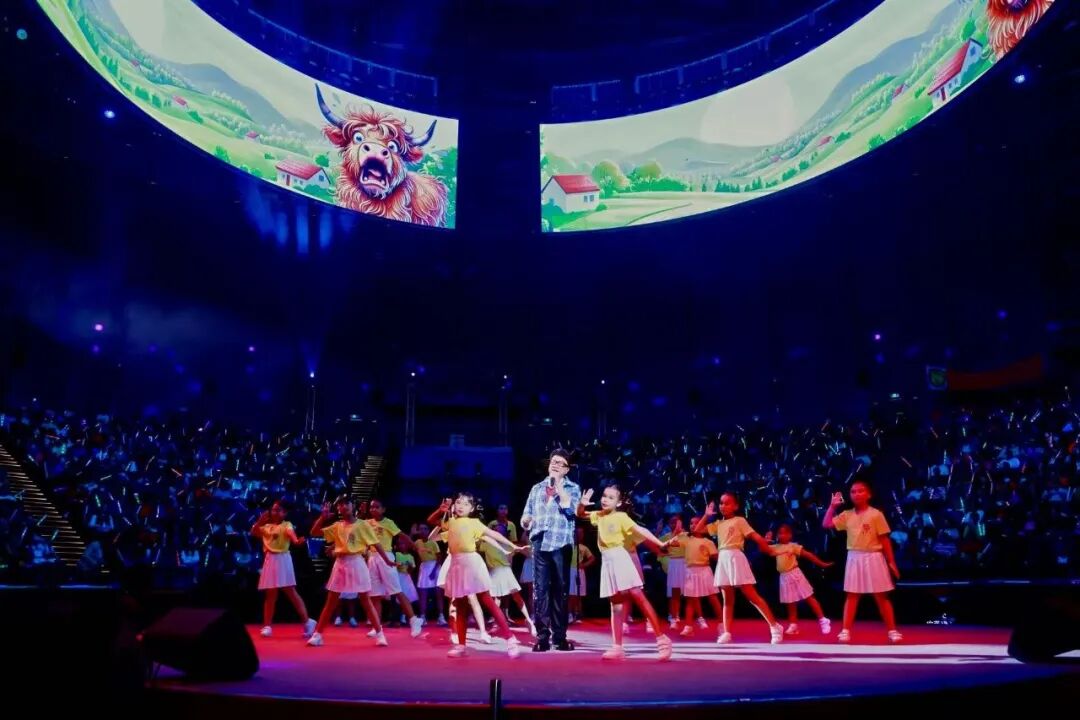 精彩瞬间:“小脚板大地行至叻星艺术团”的孩子们在徐小明博士的带领下,边唱边跳演绎《牛郎》。“牛牛你乖~”纯真歌声与活泼舞步相映成趣,尽显童真魅力。