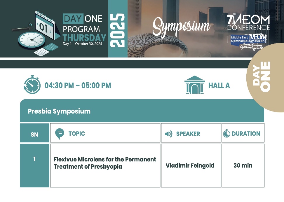 与此同时,Presbia将参与2025年10月30日至11月1日在迪拜举办的第七届中东眼科学大会(7thMEOM)。Presbia首席科学家VladimirFeingold博士将于10月31日下午4:30至5:00在A厅(HALLA)发表题为《FlexivueMicrolensforthePermanentTreatmentofPresbyopia》的专题演讲,分享FM微透镜在全球临床应用中的最新突破与长期疗效数据,届时将展示FM微透镜为世界眼科老视矫正领域带来的更多选择。