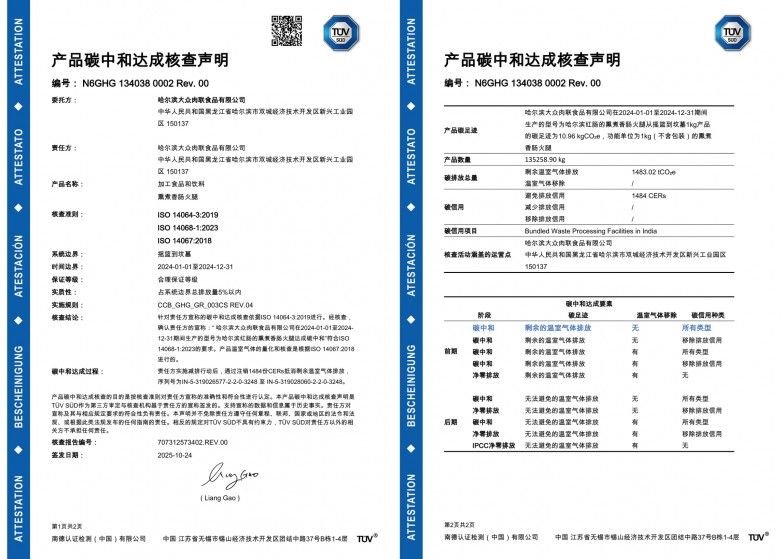 哈肉联的碳中和实践注重科学验证与第三方背书:此款哈尔滨红肠已通过TÜV南德(国际权威第三方检测机构)依据ISO14068标准的核查认证,从碳足迹核算到碳中和认证,每一步均符合国际规范。同时采用“减排为主、抵消为辅”的策略——先通过全链路减碳降低大部分排放,剩余无法避免的少量排放,再通过碳汇项目抵消。