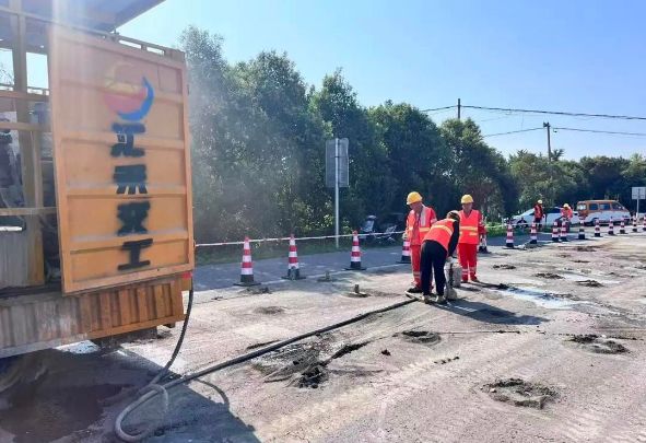 本次大中修项目的核心技术之一是地聚物注浆技术。这是一种环保、高效的地基加固方法,通过注入特殊材料填充路基空隙,提升道路承载力和耐久性。然而,该工艺对施工环境和技术操作要求极高,尤其在高温条件下,材料凝固速度加快,注浆压力和时机的把控尤为关键。