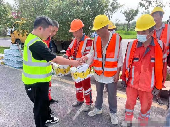 高温无情人有情。施工人员的辛苦付出,牵动着盐城公路中心和总包单位领导的心。8月26日上午,单位负责人一行来到施工现场,为工人们送来了一份“清凉”。