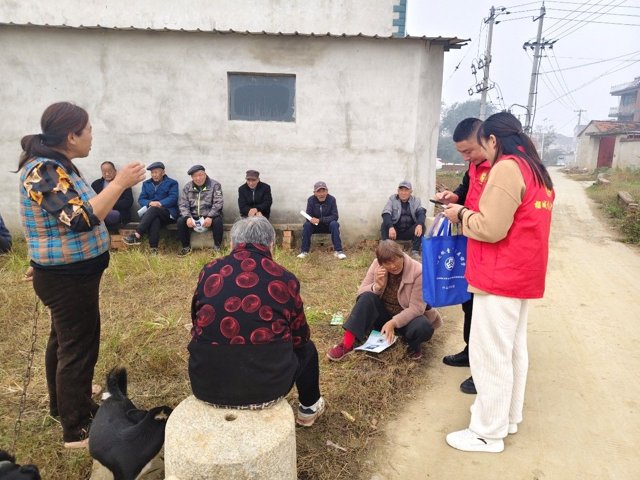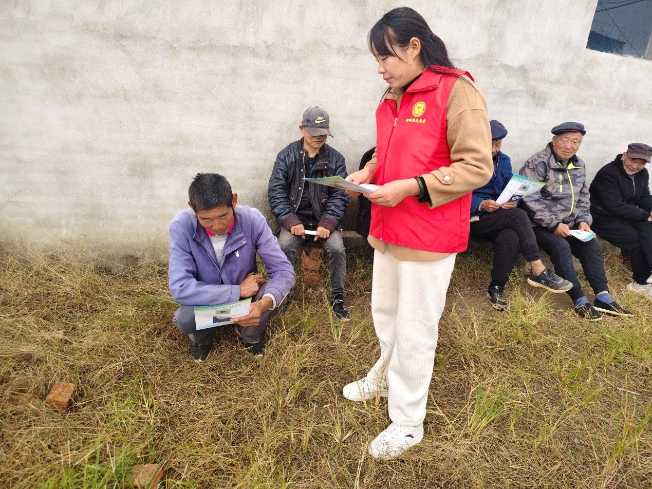 村干部在村民集中聊天的村口发放宣传单,讲解医保政策