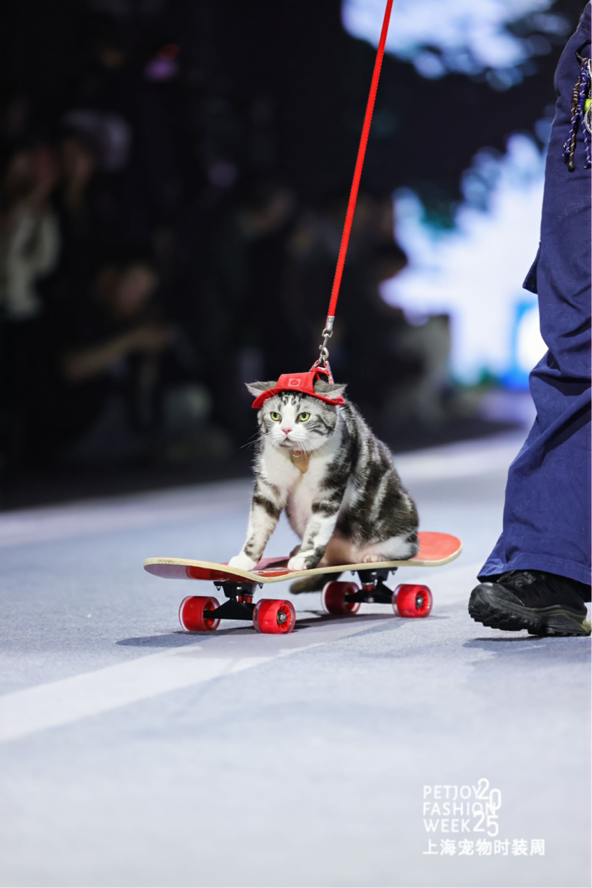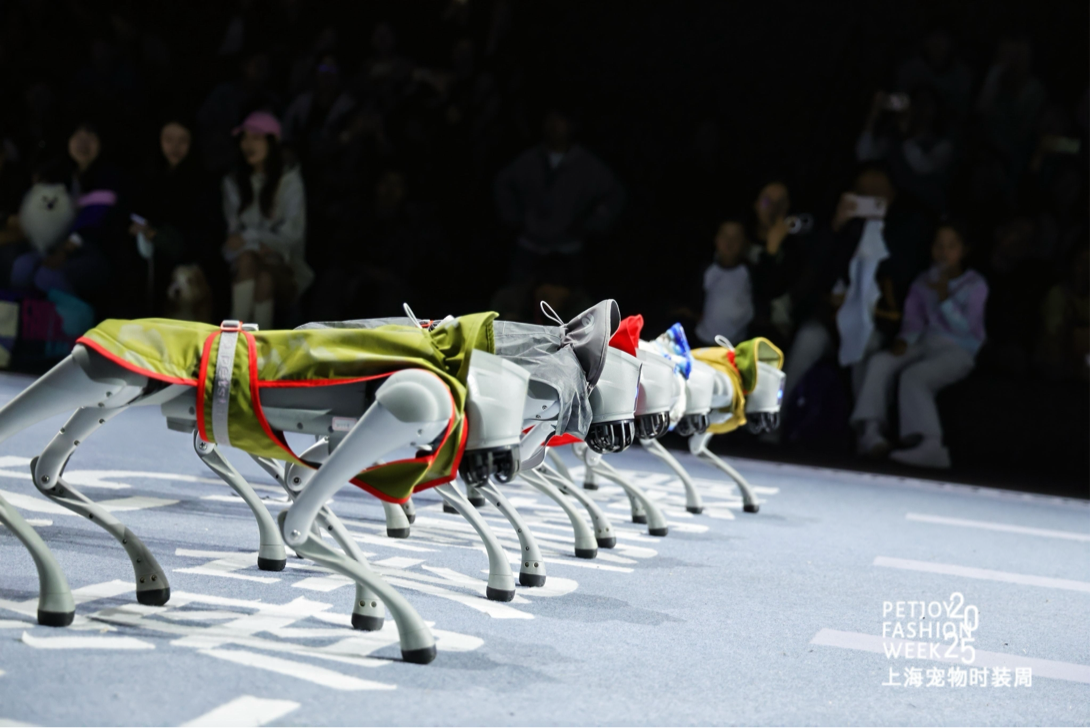 而在大秀压轴环节,五只科技感十足的机器狗惊喜登场,与活力四射的毛孩子同台演绎,将“自然野趣”与“未来科技”巧妙融合,也将现场氛围推向高潮。这一刻,观众们看到的不仅是时尚的突破,更是人与宠物、自然与科技之间无界共生的可能。