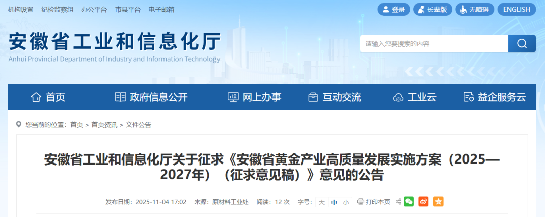 安徽省工业和信息化厅关于征求《安徽省黄金产业高质量发展实施方案(2025—2027年)(征求意见稿)》意见的公告