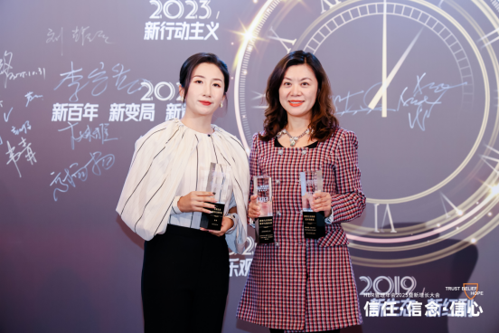 领创集团首席幕僚官、首席市场官李蜜(右一)与ADVANCE.AI中国市场部负责人王俊丽(左一)出席颁奖典礼
