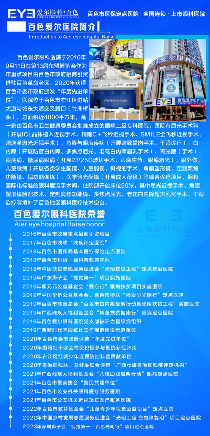 百色爱尔眼科医院将以专业的医疗团队、先进的设备技术与温馨的就诊环境,为每一位患者提供安全、有效、优质的视觉健康服务。