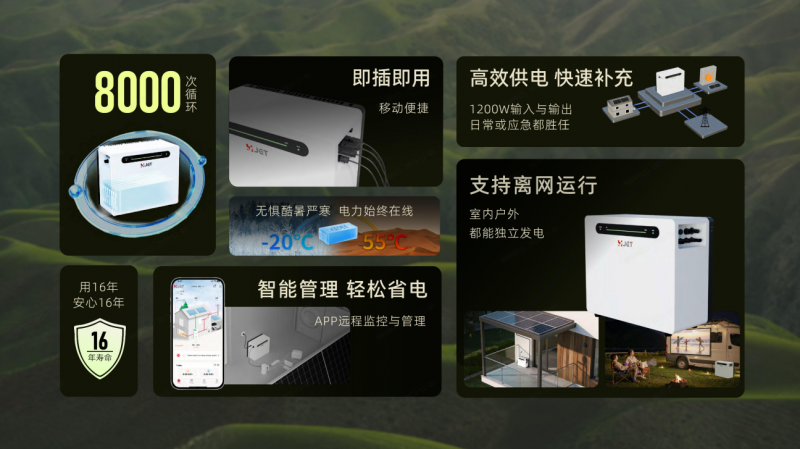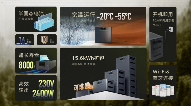 GreenArk Pro混合储能系统:具备2.4kW额定输出功率,支持-20℃至55℃宽温域运行,基础容量2.6kWh,可扩容至15.6kWh。搭载半固态电池术,循环寿命可达8000次,相当于16年以上日常使用。产品设计强调极简安装,用户可在10分钟内完成部署,无需专业电工,通过Wi-Fi/蓝牙即可实现智能管理。