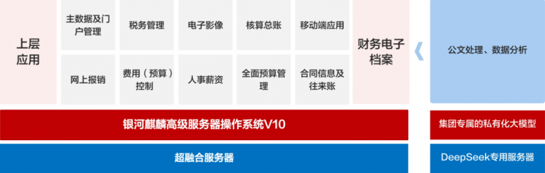 根据该集团财务信息化整体建设遵循“整体规划、分步实施、试点先行、全面推广”的原则,建设基于网信环境的新集团的组织架构和管理模式,本次项目整体以银河麒麟高级服务器操作系统V10为安全基石,充分满足集团各级单位切换到网信版财务系统(第三版)处理业务的实际需求,提升财务系统及其多个子系统的整体运算能力、存储能力和安全防护能力。