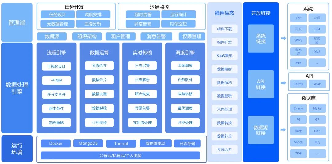 1.功能全面:集离线数据集成ETL、ELT、CDC实时数据集成、编排调度、数据服务API为一体的数据集成平台,一站式满足企业的各种最为复杂的数据集成场景。提供私有化部署能力和云原生架构,满足企业不同发展阶段的业务需求。