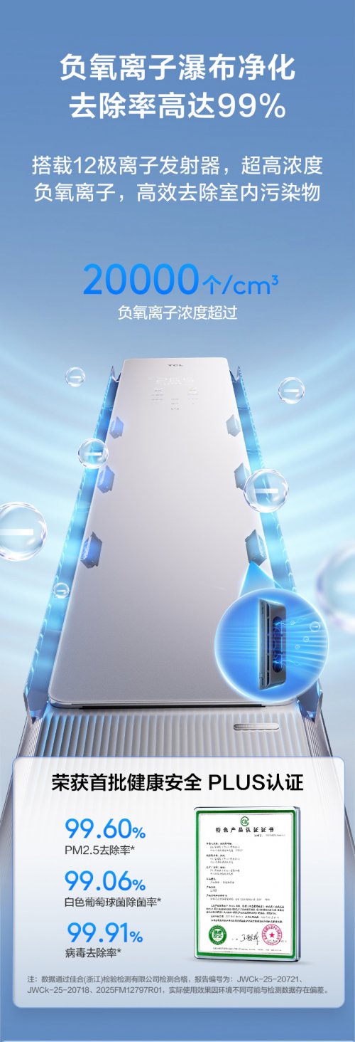 冬季门窗紧闭时,室内二氧化碳浓度常超2000ppm,甲醛、PM2.5等污染物浓度飙升。TCL小蓝翼 P6 Plus AI 健康空调搭载的12极离子发射器,可释放超20000个/cm³的负氧离子,形成"森林级"清新环境。