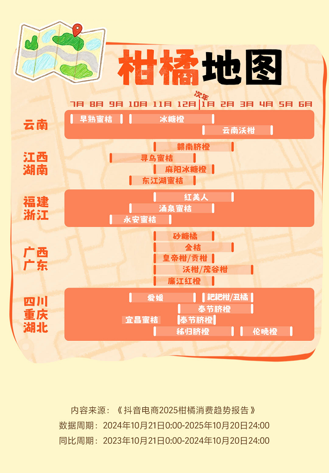 得益于成熟期差异,不同类型的柑橘完美串联起全年无断档的供给,让消费者在四季流转中持续收获味蕾的满足。在抖音电商平台,每年7月起,云南早熟蜜桔率先拉开尝鲜序幕;10月前后,川渝的爱媛果冻橙迎来成熟期;进入11月,江西脐橙、湖南冰糖橙、浙江红美人、广东贡柑、广西砂糖橘接力登场;跨过年关,1月至4月有广西沃柑坐镇,湖北秭归春橙更能一直供应到次年5月。