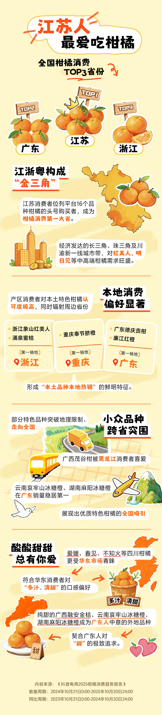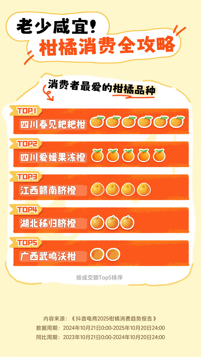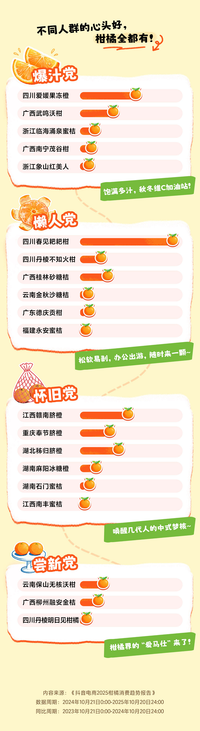 与此同时,抖音电商丰富的柑橘供给满足了不同人群、特定场景的消费需求。例如:爆汁党偏爱四川爱媛果冻橙、广西武鸣沃柑等饱满多汁的品类,成为秋冬维C补给的首选;懒人党钟情四川春见耙耙柑、广西桂林砂糖橘等松软易剥的品种,适配办公出游等随时食用的场景;怀旧党对江西赣南脐橙、湖北秨归脐橙等经典柑橘情有独钟;尝新党则热衷于云南保山无核沃柑、广西柳州融安金桔等柑橘界的“新贵”。