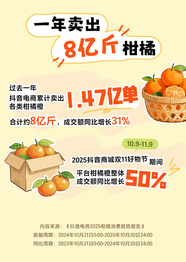 数据显示,2024年10月至2025年10月,抖音电商累计卖出各类柑橘橙1.47亿单,合计约8亿斤,成交额同比增长31%。在“山货上头条”“金产地计划”等助农专项及双11等大促活动助推下,秭归春橙、哀牢山冰糖橙等一批优质柑橘果品借抖音“出圈”,被消费者知晓和喜爱。“2025抖音商城双11好物节”期间(10月9日至11月9日),平台柑橘橙整体成交额同比增长50%。