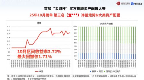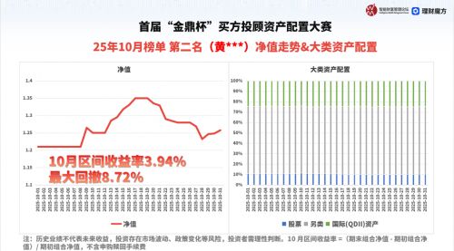 10月榜亚军“黄***”(参赛组合名)以3.94%收益率紧随其后,配置聚焦另类资产与QDII资产,在市场波动中保持收益稳定性。
