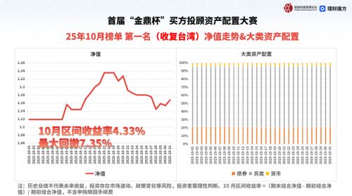 10月榜冠军以4.33%的绝对收益登顶,组合配置70%黄金、20%债券及10%货币基金,凭借量化算法结合宏观判断,精准捕捉黄金抗风险属性,同时将最大回撤控制在7.35%。