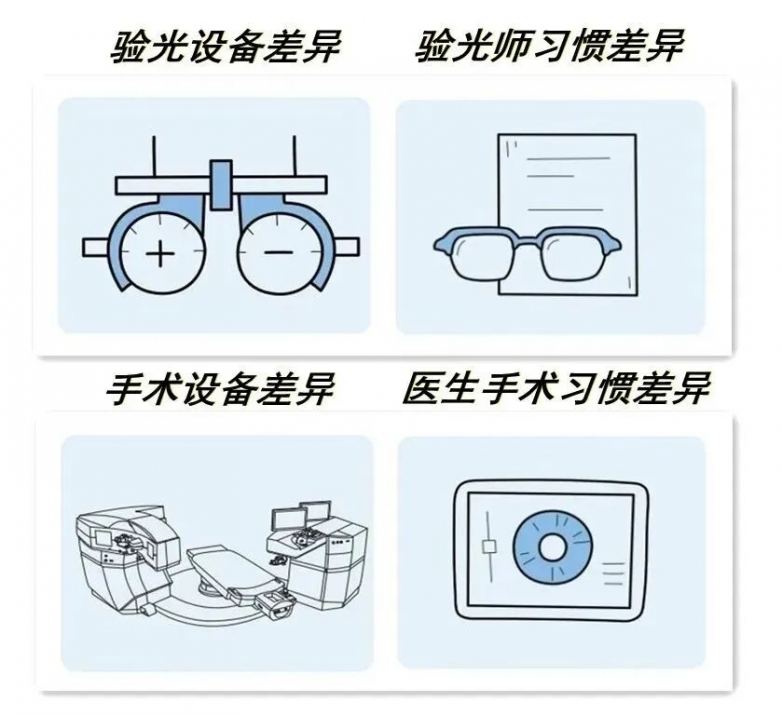 从术前检查到术前设计到实施手术这个过程会受到各种因素影响,除了个体差异,验光设备差异、验光师习惯差异、手术设备差异、医生手术习惯差异都是影响术后效果的因素。