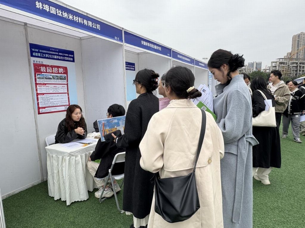 11 月 12 日下午,成都理工大学就业指导中心招聘大厅内交流有序、氛围热烈,蚌埠市人力资源和社会保障局组织安徽华彩电器、国钛纳米、德微创芯等5家重点企业组团参会,精准对接高校人才资源,本次校园招聘会的顺利举办,现实了企业引才需求与学子就业意向的双向奔赴。