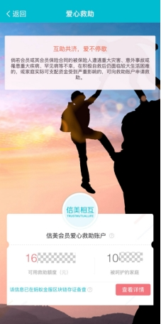 据了解,信美2017年行业首创“会员爱心救助账户”,希望能汇集全体会员之力,帮助经过自救后仍有困难的会员及家庭渡过难关,将爱心和互助的理念持续传递,同时也希望通过这样的机制提升大众的风险保障及自救意识。