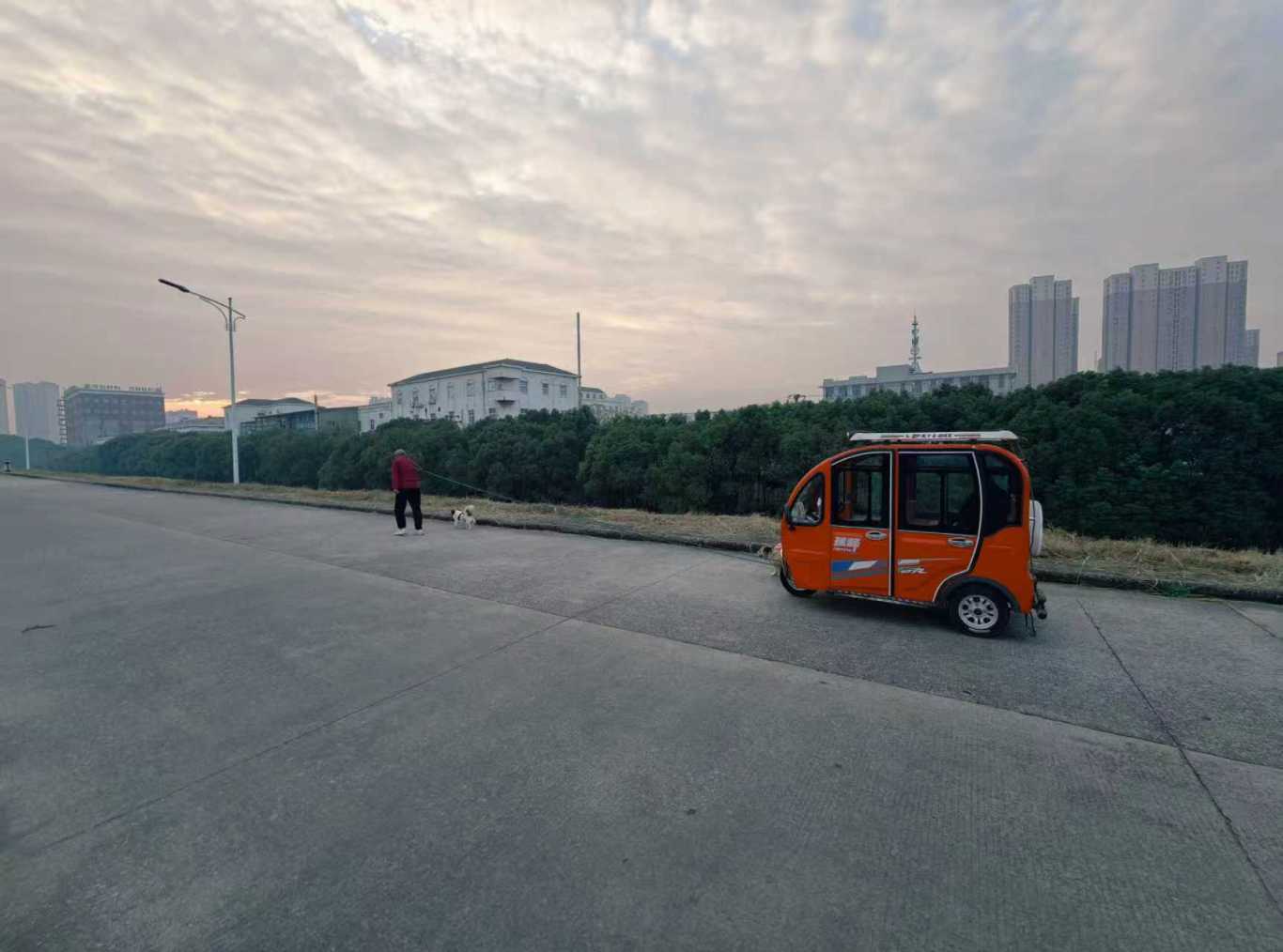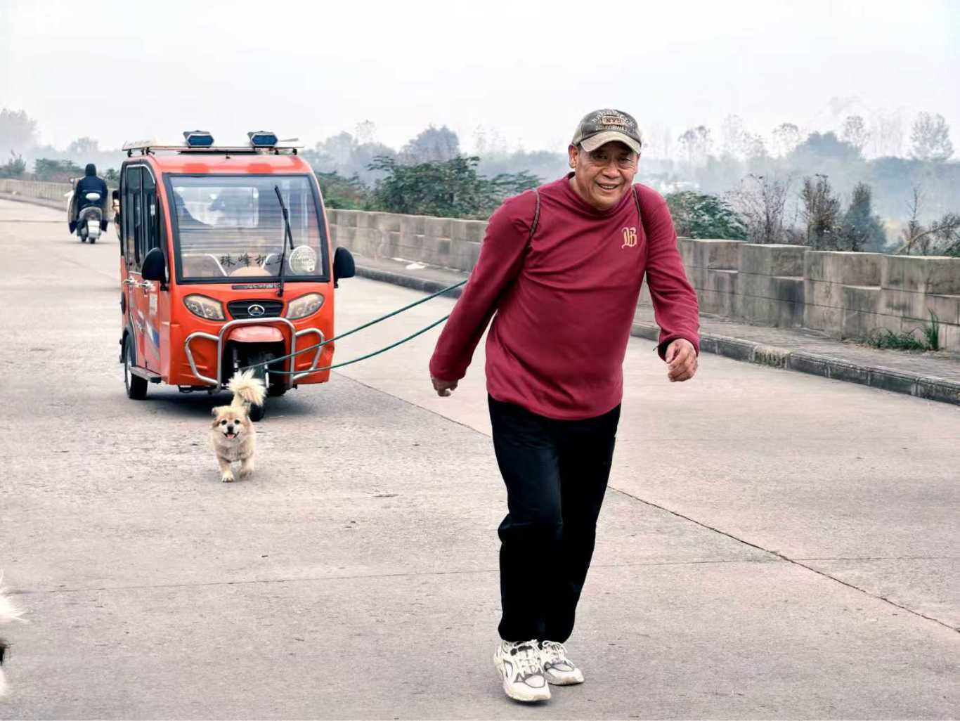 “老爷子虚岁100啦!1926年生,身子骨还算硬朗!” 刘德才边调整肩头的绳结边笑着说道。四年前,他发现父亲年迈不愿在家喜欢坐三轮车出行,偶然间想到用绳子拉车,既能让老父亲出来放风、遛弯、散心,自己也能顺便锻炼,一举两得,便开启了每日两趟的 “拉车晨练”。如今,他每天清晨六点至七点多、下午一点多到三四点准时出发,沿淮河堤坝往返三公里,刚够老人舒心、自己尽兴。