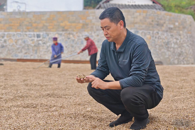 图:兴仁薏仁米产业有限公司董事长夏召和正在查看从农户收购来的薏仁米