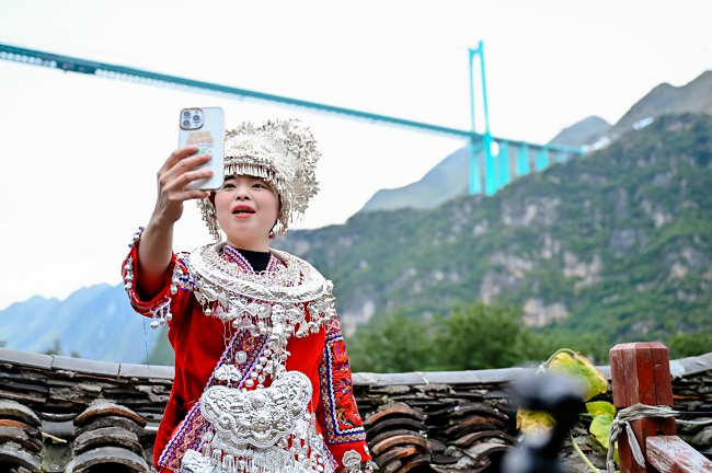图:小花江村村民通过5G网络与网友分享大桥美景