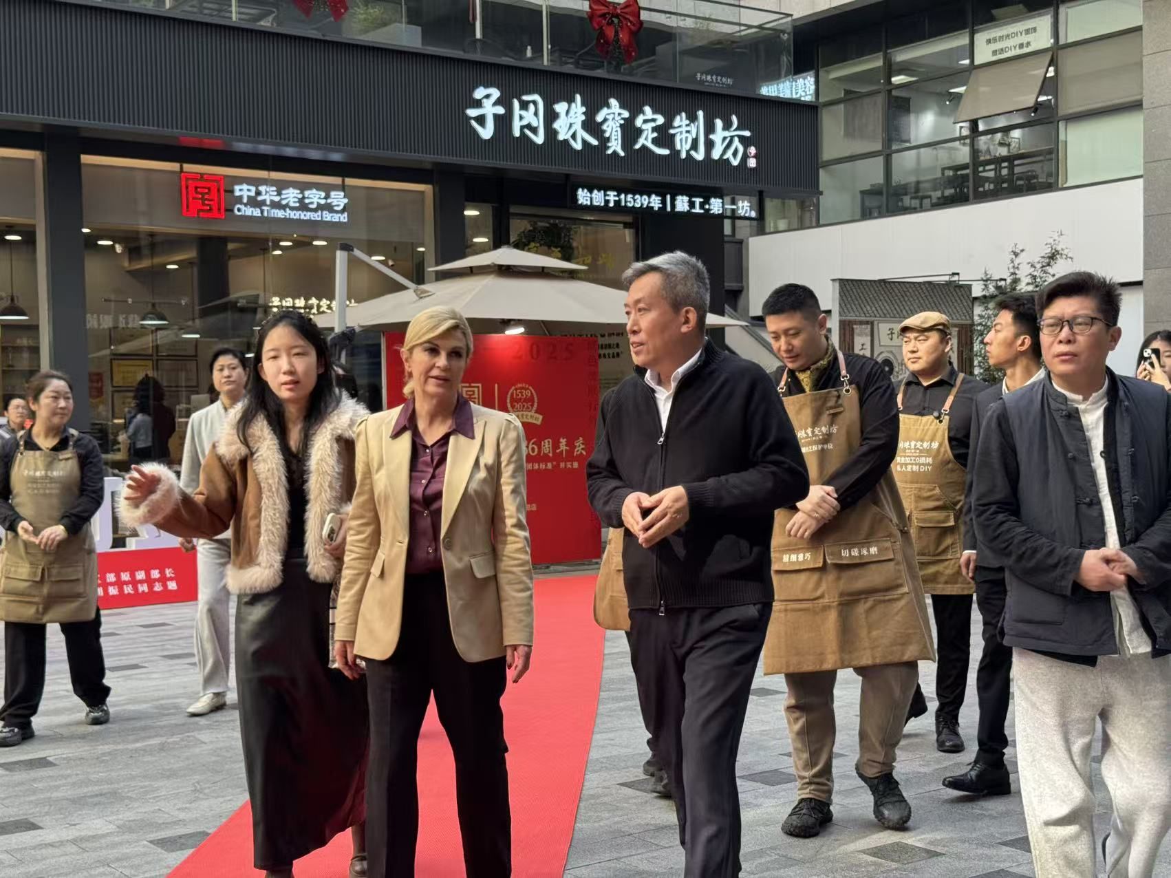 工坊迎来的首位顾客,是克罗地亚前总统科琳达女士。子冈团队以多瑙河粼粼波光为灵感源泉,为其量身定制金玉双镯,现场以锤錾、镶嵌等传统技法精工细作。得知科琳达女士是足球爱好者,子冈设计师巧妙融合智能金工工艺,打造出一枚别具一格的足球徽章伴手礼。