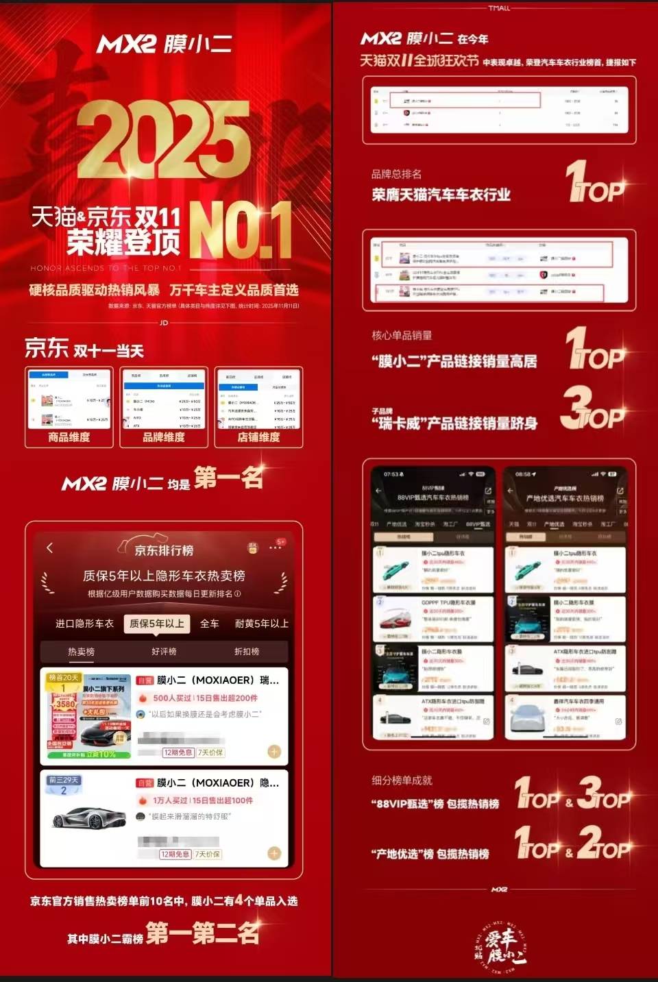 2025年双十一圆满收官,国产车衣领军品牌膜小二再次以实力印证行业地位,交出了一份亮眼的成绩单:膜小二不论从商品维度、品牌维度还是店铺维度均荣膺京东平台车衣行业第一名。京东官方销售热卖榜单前10名中,膜小二有4个单品强势入围,霸榜前两名。