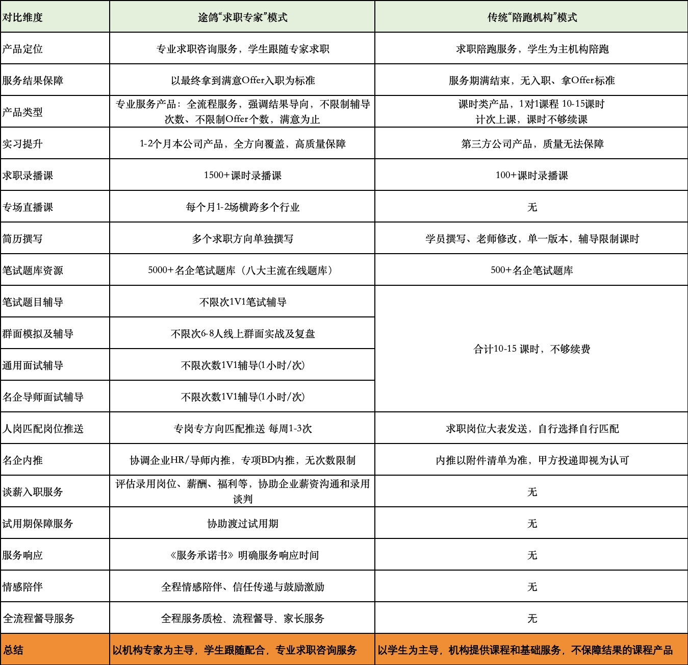 陪跑机构的核心逻辑是学生主导、机构辅助;而专业求职服务应当是机构专家主导、学生跟随配合。途鸽求职Togo Career明确提出了“我们带队,我们推送,我们辅导,我们保障”的服务理念,将求职过程中的专业关键环节责任主体从学生转移到专业团队。