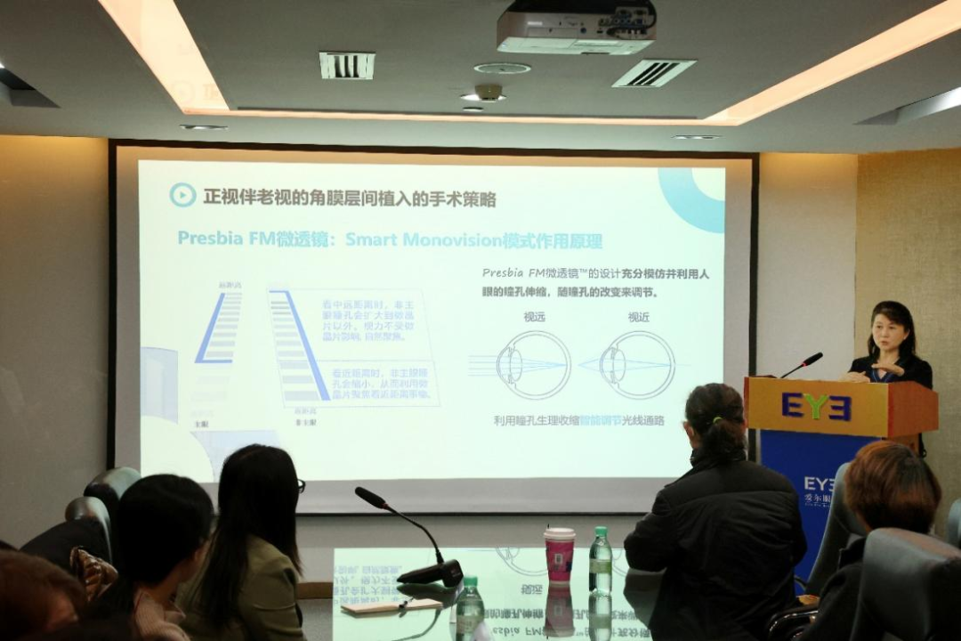 爱尔眼科医院集团老视矫正MDT管理学组组长、北京区副总院长、北京爱尔英智眼科医院副院长张丰菊教授,爱尔英智屈光手术科周继红主任、王文娟主任及Presbia集团临床团队出席本次活动,围绕国内外老视现状、患者需求、临床解决方案以及Presbia FM微透镜矫正老视技术展开深度分享与交流。