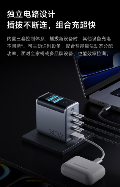 这款集140W大功率输出、1.3’臻彩智显屏、3C1A四接口配置、IDC智能动态快充技术于一体的超能体,旨在解决多设备用户的充电难题与焦虑,以重新定义大功率超快充的智能便捷体验。