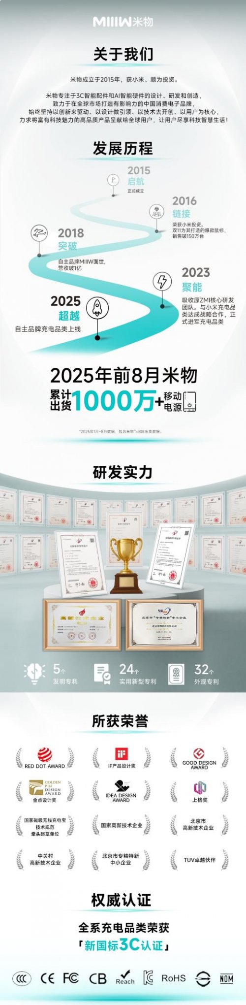 米物科技成立于2015年,是一家小米生态链核心技术企业、国家级专精特新中小企业。米物专注于3C智能配件和AI智能硬件的设计、研发和创造,致力于打造具有全球影响力的中国消费电子品牌。公司累计获得发明专利5项、实用新型专利24项、外观设计专利32项,产品斩获iF、红点等国际设计大奖,米物始终坚持以创新来驱动、以设计做引领、以技术去开创、以用户为核心,力求将富有科技魅力的高品质产品呈献给全球用户,让用户尽享科技智慧生活!