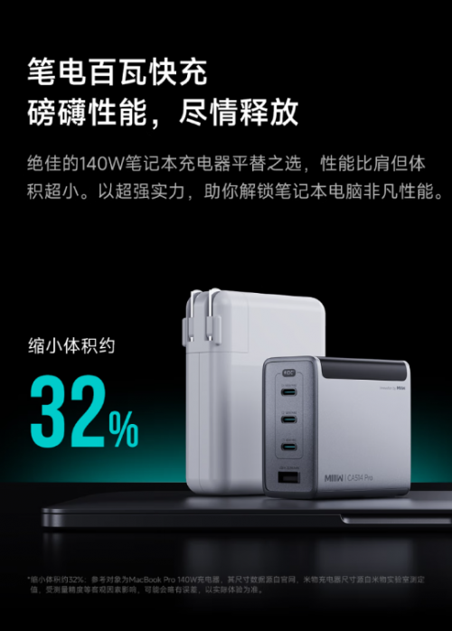 第一,采用新一代氮化镓芯片GaN+ Pro,单口功率最高可达140W,性能更强,充电更快!同时升级 Mini芯片堆叠技术,将新一代氮化镓芯片和定制平面变压器合二为一,在大大提升能量转化效率的同时大幅缩减机身体积,相比同功率苹果充电器,体积减小近1/3!配合折叠插脚设计,差旅出行收纳更轻松。