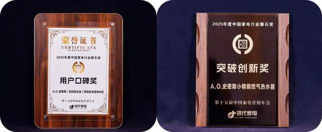 此次年会,A.O.史密斯品牌凭借稳健的市场表现、深厚的技术积淀与广泛的行业影响力,斩获2025年度中国家电行业“坚如磐石奖”;旗下年轻子品牌A.O.史密斯-佳尼特则以精准的市场定位、高性价比的产品矩阵与场景化创新设计,荣获“行业突出贡献奖”,彰显品牌在全人群、全场景市场的深度覆盖能力与行业担当。