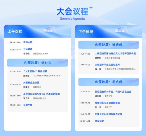 在这关键转折点,奥哲在12月5日隆重举办「智现新生 | 2025未来企业大会」将与您共探通向未来企业的进化路径。大会重磅集结来自国家级创新平台之江实验室的科学家、国际知名咨询机构普华永道的AI战略专家,携手来自各行各业的企业智能化转型核心负责人,共同分享从AI规划、AI人才、AI平台到AI落地的全链路洞察与前沿实践。