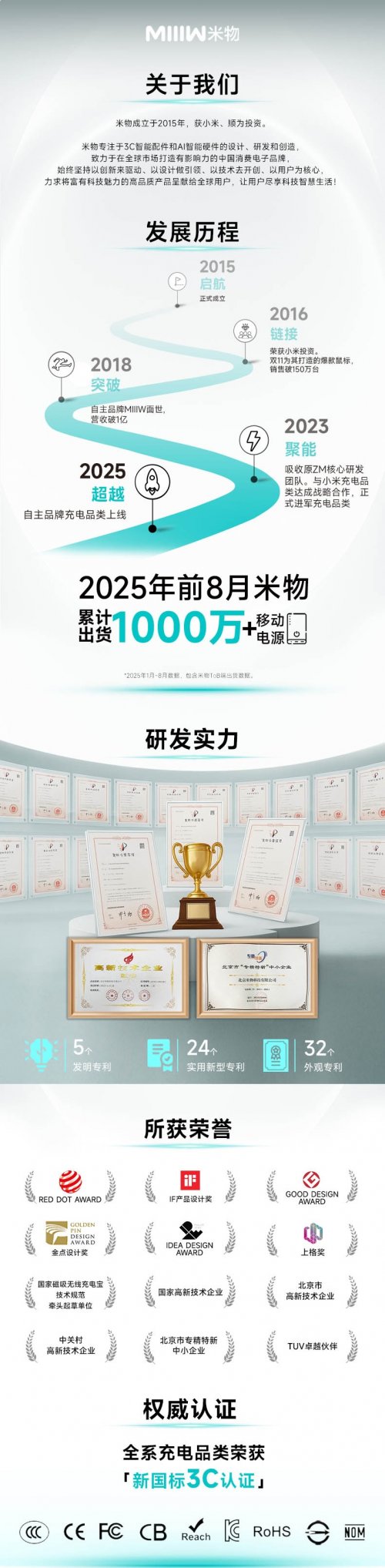 而米物作为深耕3C数码和AI硬件领域的创新企业,自2015年成立以来,始终专注于智能终端设备的研发与设计。而在2023年米物在吸收了原ZM核心充电品类团队后,开始重点发力充电品类,成为小米充电宝的御用研发设计及生产制造厂商。仅2025年前8月,米物的充电宝出货量就超过1000万!